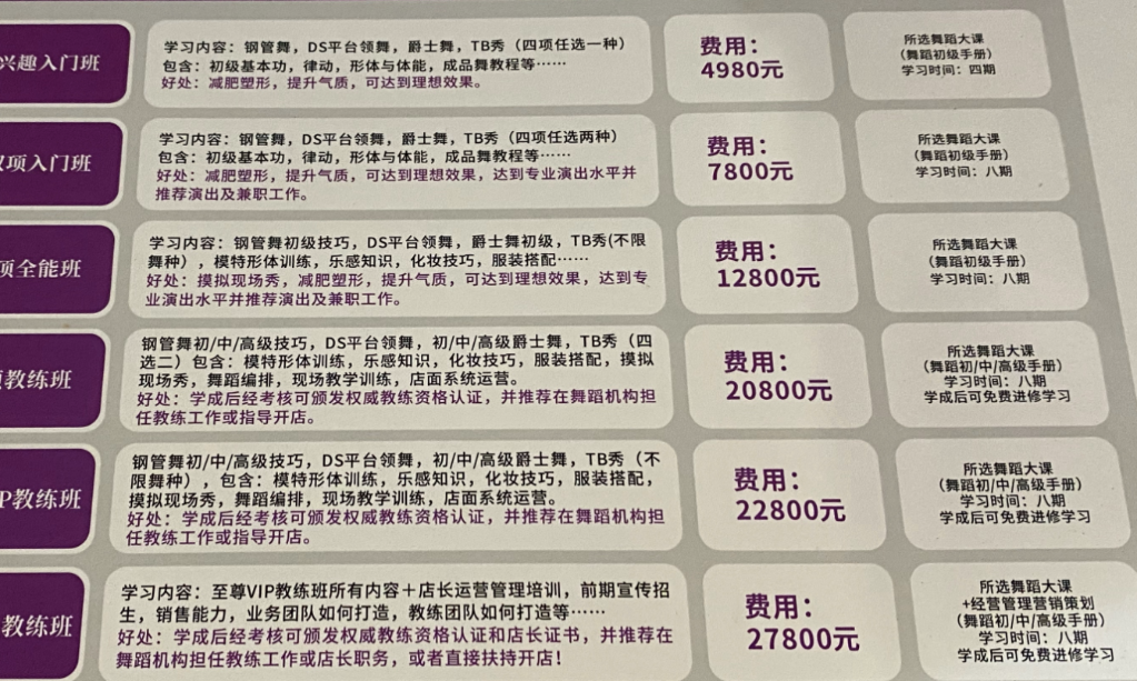 某舞蹈机构课程收费表。新华社记者刘岭逸摄 北京市炜衡(南宁)律师事务所律师黄宇表示,这些公司的经营行为涉及金融监管、公安、市场监管、人社、教育等多个部门,法律关系十分复杂,一些求职者明知自己上当受骗,但难以承担维权的时间成本和金钱成本,往往会自认倒霉、息事宁人。 业内人士建议,相关部门应齐抓共管,加大对“培训贷”的打击力度。 黄宇表示,建议教育、人社、公安等部门通过“防骗进校园”等形式,加大对毕业大学生金融、就业、法律方面的知识培训,提高毕业生对各种形式“培训贷”陷阱的辨别能力和自我保护能力,增强防范意识。 南宁市12315中心工作人员颜红日建议,加大防范“培训贷”的宣传力度,提示大学毕业生谨慎使用金融贷款,并保留好相关消费凭证,用法律武器维护自己的合法权益。在与培训机构签订协议与合同时,应仔细阅读核对相关内容,对于不利的条款应及时提出,商议或修改后再签订。如不慎踏入“培训贷”陷阱或者遇到疑似“培训贷”诈骗的情形,应积极收集并留存有关证据,如涉及教育培训纠纷的,向培训机构注册地所在的教育主管部门投诉;涉嫌诈骗的,应向公安机关报案。 甘锡海说,“培训贷”乱象涉及多个行业领域,仅靠某个部门单独执法无法从根本上解决问题,应厘清市场监管、人社、公安等部门的职责权限。对涉嫌合同诈骗,以欺诈、胁迫等方式强制捆绑培训贷款和非法集资等违法行为,坚决予以打击。 |