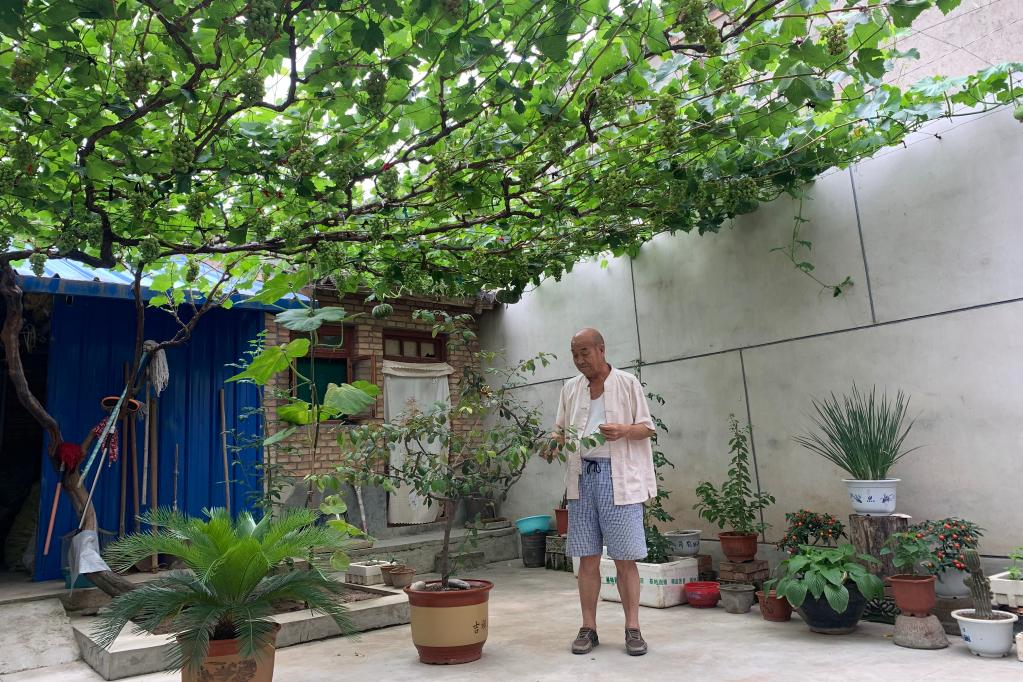 胡家大庄村的一户小院里,葡萄已经结果。新华社记者张玉洁摄 胡家大庄村积极发展产业。一些人外出搞建筑、做家政、当保安,一些人在村上经营果园,一些人通过酿酒酿蜜、加工粉条致富。村集体经济逐步壮大,还建成了果蔬存储能力达2000多吨的气调库。“国家政策好了,产业结构调整好了,老百姓的钱袋子鼓了。”胡雲说。