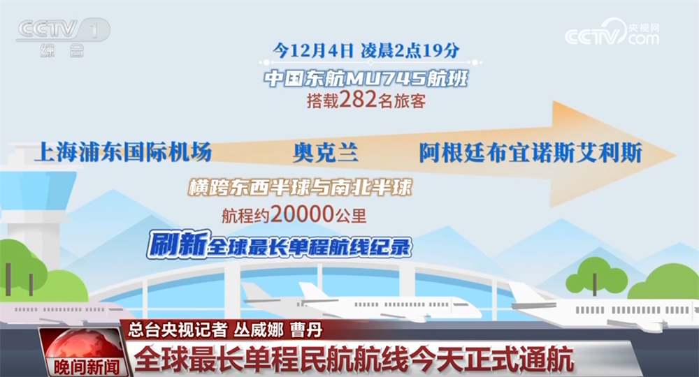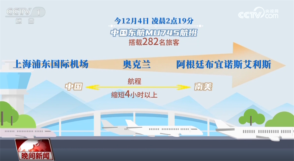 12月4日凌晨2点19分,中国东航MU745航班搭载着282名旅客从上海浦东国际机场起飞,经奥克兰,最终将到达阿根廷布宜诺斯艾利斯。这条横跨东西半球与南北半球、航程约两万公里的航线,刷新了全球最长单程航线的纪录,并将中国至南美的航程缩短四小时以上。
