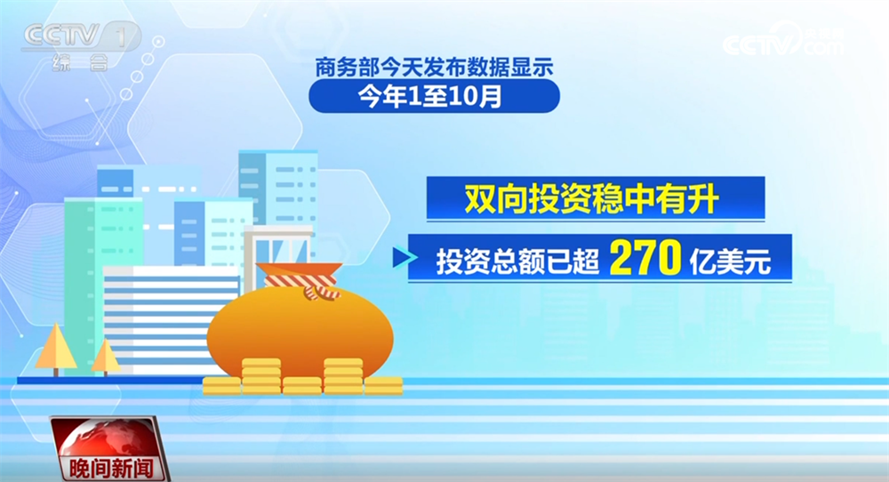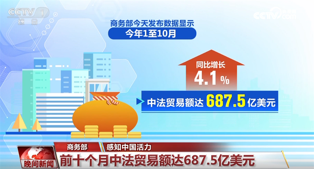 央视网消息:这两天,我国多领域创新发展取得突破。最新发布的经济数据显示,我国经济保持稳中有进的发展态势。 商务部12月4日发布数据显示,今年1至10月,中法贸易额达687.5亿美元,同比增长4.1%;双向投资稳中有升,投资总额已超270亿美元。