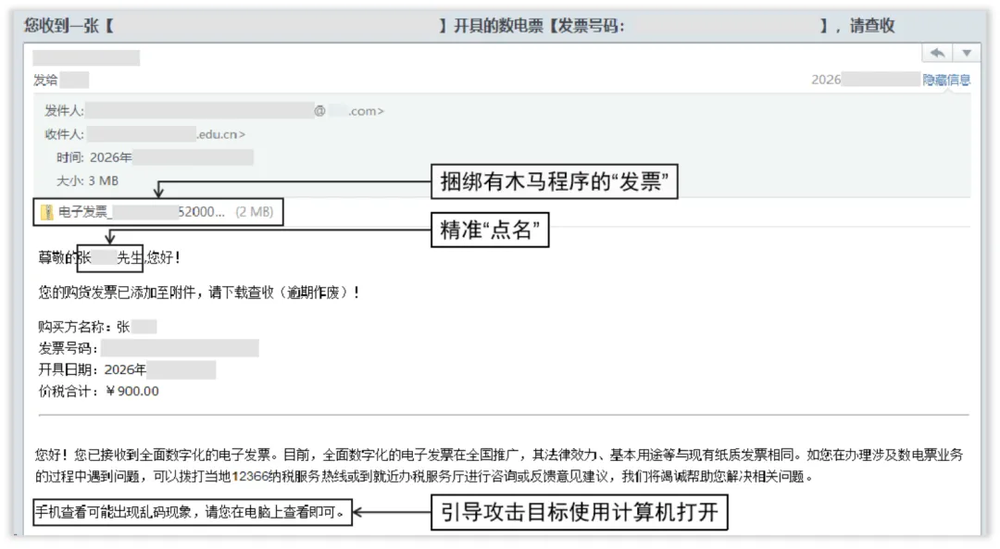 国家安全部今天发布安全提示文章,“【电子发票】张某某先生,您的发票已开好,请点击下载”——当收件箱弹出这类带着你真实姓名的电子邮件,你是否会下意识点击?注意!这可能是境外间谍情报机关实施的精准网络攻击。一旦点击邮件中的附件或者链接,设备将瞬间沦为间谍窃密的“突破口”,安全风险随之而来。 “发票陷阱”入侵套路 标题引诱+紧迫感逼单。 岁末年初报销忙、账务急,境外攻击者抓住结算封账的时间点,伪装成电信运营商、电商平台或旅游平台客服,以“收件人姓名+电子发票”为主题构造钓鱼邮件。其中邮件正文中还会特别强调“逾期作废”“发票有误需重开”等字样制造紧迫感,降低警惕性,毕竟在不少人的潜意识里“一张发票能有多大危害”?但真正的陷阱就隐藏在附件或链接中,看似是一份普通的发票文件,实则是境外黑客组织精心伪装的木马程序。