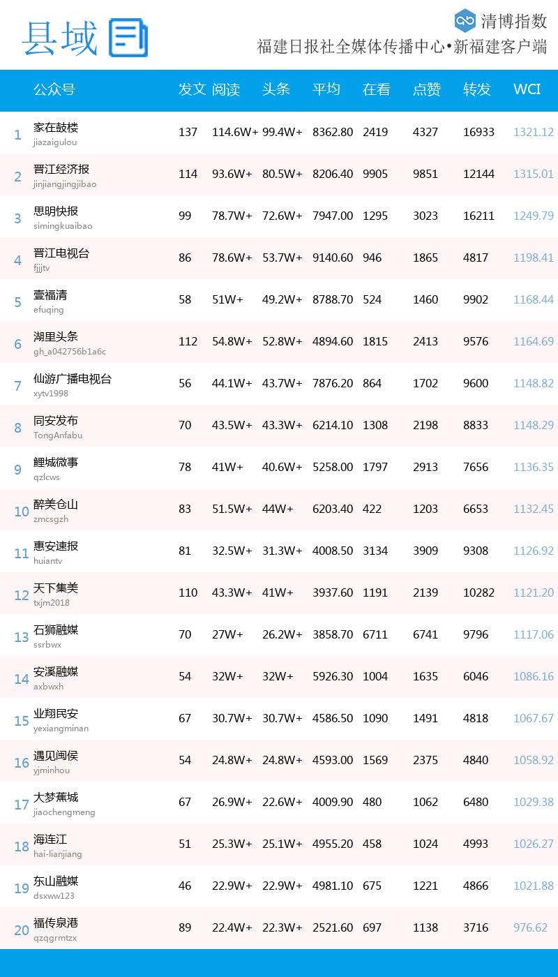 本期县域微信影响力指数,多号厚积薄发,2个账号新入围。“家在鼓楼”“晋江经济报”稳居前二,“思明快报”提升1位,拿下榜三;“湖里头条”实力进阶,从上期第十来到本期第六;“同安发布”“醉美仓山”拾级而上,从上期第十一、第十二来到本期第八、第十;“天下集美”“业翔民安”均提升1个位次,收获本期第十二、第十五;“壹福清”“鲤城微事”“安溪融媒”“东山融媒”稳扎稳打,收获本期第五、第九、第十四、第十九;“遇见闽侯”“海连江”重新登榜,收获本期第十六、第十八。 热文方面,本期共有1篇10W+稿件,来自“思明快报”。“思明快报”的《淬炼作风立潮头,勇挑大梁看思明》位列热文榜首,“家在鼓楼”的《迪丽热巴发文报平安》位列热文榜二,“醉美仓山”的《陈嘉伟开会时突然晕倒,不幸离世,年仅36岁,留下3个孩子》位列热文榜三;“遇见闽侯”的《正式通车!闽侯这条主干道升级完成》位列原创热文榜首。