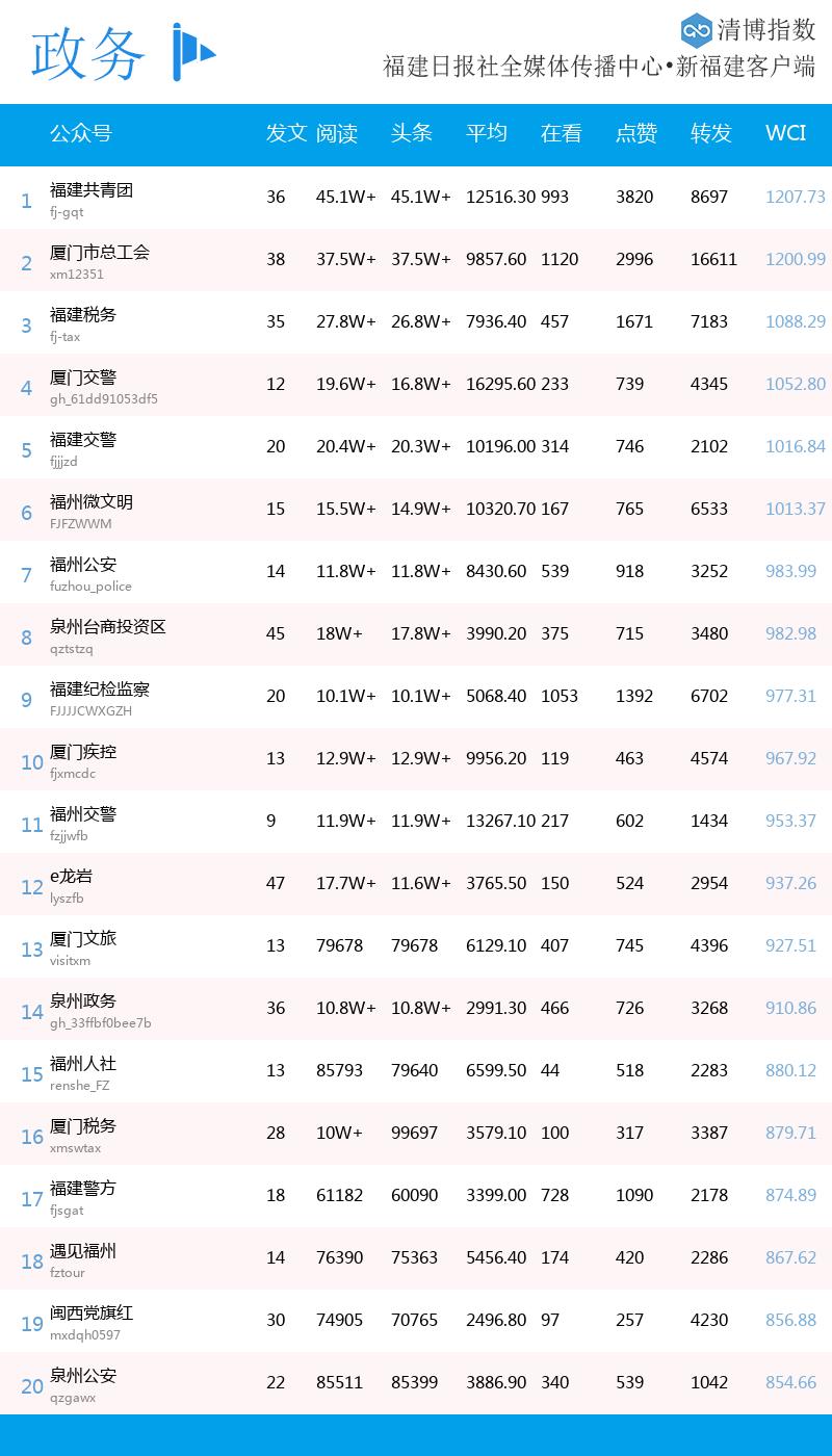 本期政务微信影响力指数,多号强势升位,4个账号新入榜。“福建共青团”“厦门市总工会”蝉联榜单前二,“福建税务”向前1位,收获榜三;“厦门交警”提升13个位次,收获本期第四;“泉州台商投资区”“福建纪检监察”势如破竹,分别从上期第二十、第十八跃居本期第八、第九;“福州公安”“厦门疾控”小步快跑,从上期第十、第十二来到本期第七、第十;“福州微文明”“厦门文旅”均提升1个位次,收获本期第六、第十三;“福建交警”稳扎稳打,位居本期第五;“e龙岩”“福州人社”“闽西党旗红”“泉州公安”重新回榜,收获本期第十二、第十五、第十九、第二十。 热文方面,“福建共青团”的《建议“不调休”的代表,被记者围住了!》位居热文榜首,“厦门市总工会”的《满50减49.9、满158元减100元……新一波开工福利来啦》位居热文榜二,“厦门交警”的《最快109km/h!这些车超速被曝光→》位列热文榜三;“遇见福州”的《25米福鱼空飘、毛晓彤领舞……福州这些元宵活动嗨翻全城》位列原创热文榜首。 县域、媒体(省、市)、政务微信影响力指数每周发布一次,每个类别取其计算排名前二十的微信公众号,上榜账号周发文数不低于7。县域、旅游、健康、教育、校园微信影响力指数月度分析每月发布一次,县域微信影响力指数分析取其计算排名前二十的公众号,旅游、健康、教育、校园微信影响力指数分析每个类别取其计算排名前十的公众号,相关账号月发文数不低于20。暂时只收录省内订阅号,不收录服务号。 其中,县域微信影响力指数以全省84个县(市、区)的政府发布、媒体、县级融媒体中心等微信公众号为样本。媒体(省、市)微信影响力指数监测样本为市级以上媒体;政务微信影响力指数监测样本为省直单位政务号,各设区市、县(市、区)级单位政务号,但不包含县级政府发布。如有疏漏,请留言联系我们。 清博指数对各微信公众号的数据,每日采集两次,采集时间为每日的凌晨0点与每日中午12点,所采集的都为该账号前一天的数据,且预览帖数据不予以统计。 综合数据计算采用业界公认WCI指数。清博指数是第三方新媒体大数据查询平台、“两微一端”新媒体大数据平台,其独有的WCI、BCI、TGI算法公式已被多家央企、500强企业引用。《福建日报》是福建地区最具影响力与公信力的主流媒体之一。由福建日报•新福建客户端发布、清博智能提供数据支持的福建地区微信影响力指数,致力于打造福建省最权威、最公正的微信影响力指数。 |