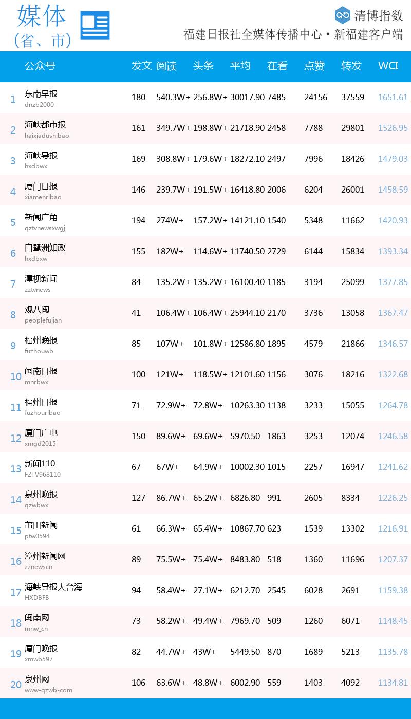 福建微信影响力指数,由福建省委宣传部指导、福建日报社主办、新福建客户端发布,由清博智能提供数据支持。 欢迎大家推荐自己喜爱或者运营的微信,想参与的微信公众号可将公众号名称及微信号发至xfjydlmz@163.com。